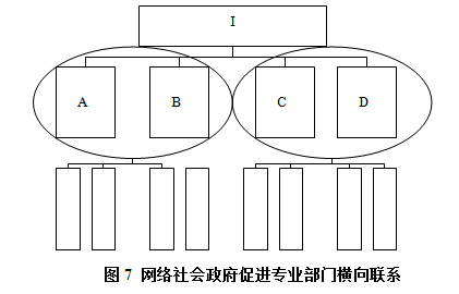 如圖7所示,A、B、C、D是四個下級管理部門,其分別下屬共八個業(yè)務部門,每個部門原轄兩個,但是由于網(wǎng)絡信息技術(shù)引發(fā)的管理幅度的增長,使得一個部門能夠承擔4個相關(guān)業(yè)務部門的管理,因此A與B,C與D,就能夠合并為新的部門。這樣對于更高一級的決策中樞I而言,相應的直接面對的部門數(shù)量就會大幅度減少。這也就是網(wǎng)絡社會由于解決了信息充分交換與處理情況下,引發(fā)的大部門制的變革。[page]