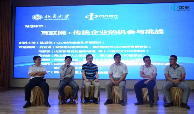 主題演講結(jié)束之后進(jìn)入到本次論壇的對(duì)話(huà)環(huán)節(jié),對(duì)話(huà)環(huán)節(jié)由CIO時(shí)代信息化學(xué)院院長(zhǎng)陳其偉先生主持,冀凱集團(tuán)信息總監(jiān),第四屆北大CIO同學(xué)會(huì)副會(huì)長(zhǎng)齊亞卓、山東東明石化副總經(jīng)理, 第十八屆北大CIO班學(xué)員馬獻(xiàn)東、南山集團(tuán)人力資源總監(jiān),第六屆北大CIO班學(xué)員王俊建、鳳凰網(wǎng)IT總監(jiān),第二屆北大互聯(lián)網(wǎng)CIO-CTO班學(xué)員王建新、山東省計(jì)算中心互聯(lián)網(wǎng)運(yùn)營(yíng)總監(jiān),山東省兩化融合促進(jìn)中心副主任,第二十屆北大CIO班學(xué)員李加偉、煙臺(tái)中集來(lái)福士海洋工程有限公司經(jīng)理蘇振寧參與了對(duì)話(huà)研討,共同就“互聯(lián)網(wǎng)+時(shí)代傳統(tǒng)企業(yè)的機(jī)會(huì)與挑戰(zhàn)”這一話(huà)題展開(kāi)討論,各位嘉賓首先分析自己企業(yè)的優(yōu)勢(shì)劣勢(shì)所在以及目前發(fā)展面臨的難題,也分享了互聯(lián)網(wǎng)+能夠?yàn)槠髽I(yè)帶來(lái)的新機(jī)會(huì)以及企業(yè)在互聯(lián)網(wǎng)+道路上面臨的新問(wèn)題,大家各抒己見(jiàn),從各自產(chǎn)業(yè)出發(fā),談痛點(diǎn)、找方向,分享各自成功經(jīng)驗(yàn)!