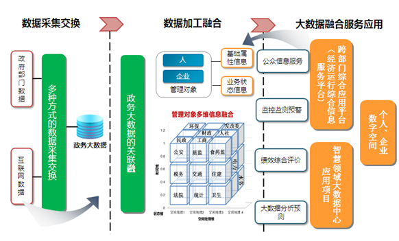政府大數(shù)據(jù)融合作為基礎(chǔ)條件,基于政府開(kāi)放、可信的數(shù)據(jù),互聯(lián)網(wǎng)公司等企業(yè)可開(kāi)發(fā)更多的創(chuàng)新型應(yīng)用,為公眾提供更多量身定制的個(gè)性化服務(wù),快速提高區(qū)域企業(yè)創(chuàng)新服務(wù)能力。