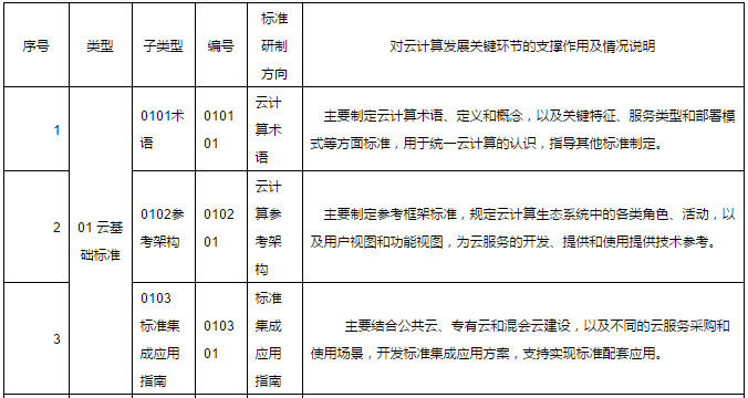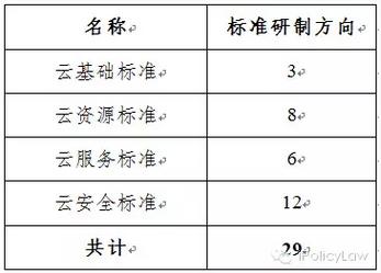 以云計(jì)算綜合標(biāo)準(zhǔn)化體系框架為基礎(chǔ),通過研究分析信息技術(shù)和通信領(lǐng)域已有標(biāo)準(zhǔn),提出現(xiàn)有標(biāo)準(zhǔn)缺失的,并能直接反映云計(jì)算特征,有效解決應(yīng)用和數(shù)據(jù)遷移、服務(wù)質(zhì)量保證、供應(yīng)商綁定、信息安全和隱私保護(hù)等問題的29個(gè)標(biāo)準(zhǔn)研制方向(如表1,詳見附件2),以指導(dǎo)具體標(biāo)準(zhǔn)的立項(xiàng)和制定。對(duì)尚未納入標(biāo)準(zhǔn)研制方向但在云計(jì)算綜合標(biāo)準(zhǔn)化體系框架中列出的,統(tǒng)一作為標(biāo)準(zhǔn)化需求研究方向。