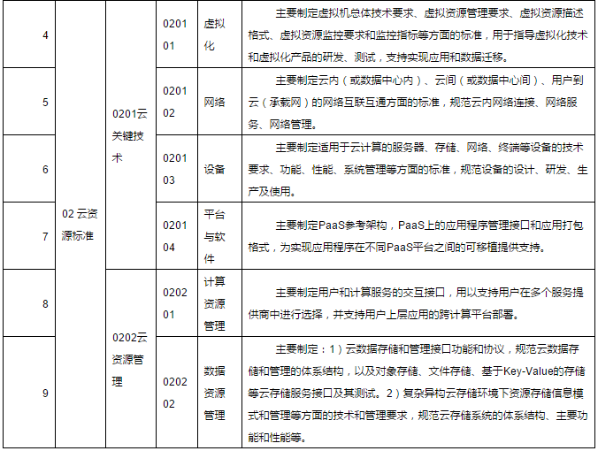 2.云資源標(biāo)準(zhǔn)。用于規(guī)范和引導(dǎo)建設(shè)云計(jì)算系統(tǒng)的關(guān)鍵軟硬件產(chǎn)品研發(fā),以及計(jì)算、存儲(chǔ)等云計(jì)算資源的管理和使用,實(shí)現(xiàn)云計(jì)算的快速?gòu)椥院涂蓴U(kuò)展性。主要包括關(guān)鍵技術(shù)、資源管理和資源運(yùn)維等方面的標(biāo)準(zhǔn)。