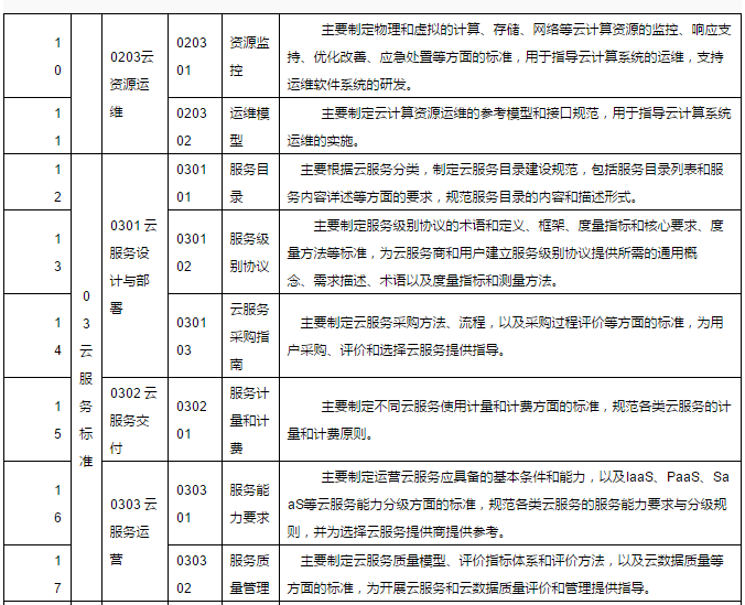3.云服務(wù)標(biāo)準(zhǔn)。用于規(guī)范云服務(wù)設(shè)計(jì)、部署、交付、運(yùn)營(yíng)和采購(gòu),以及云平臺(tái)間的數(shù)據(jù)遷移。主要包括服務(wù)采購(gòu)、服務(wù)質(zhì)量、服務(wù)計(jì)量和計(jì)費(fèi)、服務(wù)能力評(píng)價(jià)等方面的標(biāo)準(zhǔn)。