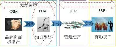 當(dāng)前制造業(yè)企業(yè)中普遍存在著四種主要的資產(chǎn)管理的需求,分別是品牌、商標(biāo)資產(chǎn)、知識(shí)型資產(chǎn)、營(yíng)運(yùn)資產(chǎn)和有形資產(chǎn)。這四種資產(chǎn)在當(dāng)前制造業(yè)從工業(yè)3.0向工業(yè)4.0階段的過渡時(shí)期對(duì)應(yīng)的信息化管理技術(shù)分別是CRM、PLM、SCM、ERP。