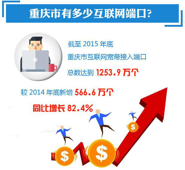 報告顯示,截至 2015 年底,重慶市光纜線路總長度達(dá)到 65.4萬公里,同比增長11.8%;互聯(lián)網(wǎng)寬帶接入端口總數(shù)達(dá)到 1253.9 萬個,較2014 年底新增 566.6 萬個,同比增長 82.4%。重慶市互聯(lián)網(wǎng)寬帶接入用戶中,速率在 8M 以上用戶占比 75.3%,較 2014 年提高 42.4 個百分點(diǎn),居全國第 17位。其中,速率在 20M 以上的寬帶用戶達(dá)到 189.3 萬戶,占比達(dá)到 37.4%,居全國第 15 位。重慶市移動電話基站數(shù)達(dá)到 9.0 萬個,較 2014 年底新增 1.6 萬個,同比增長 21.6% ;WLAN 公共運(yùn)營接入點(diǎn)(AP)數(shù)達(dá)到 13.0 萬個;3G 基站數(shù)達(dá)到2.8萬個,較2014年新增0.1萬個,同比增長3.7%;4G基站數(shù)達(dá)到3.0萬個。可以看出,目前重慶市的網(wǎng)絡(luò)成長能力大幅提升,網(wǎng)絡(luò)基礎(chǔ)設(shè)施已具備為重慶市“互聯(lián)網(wǎng) +”發(fā)展提供堅實基礎(chǔ)的條件。2015年,重慶市網(wǎng)絡(luò)基礎(chǔ)設(shè)施建設(shè)日趨完善。