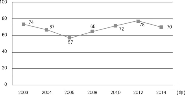 根據(jù)聯(lián)合國的評估,2008年中國電子政務(wù)在全球排名達到第65位的高位之后,電子政務(wù)的創(chuàng)新速度明顯停滯不前,發(fā)展到2014年,則下降到了第70位(參見圖1),排名下降的原因之一是聯(lián)合國的測評越來越強調(diào)電子政務(wù)的開放和參與。而與之形成鮮明對比的是,中國信息經(jīng)濟在2008年以后進入高速增長期,2013年中國信息經(jīng)濟規(guī)模達到13.3萬億元,相比于1996年增長接近38倍,占GDP的比重達到23.7%,比1996年提高18.7個百分點,比“十五”初期高出10個百分點。2008年成為電子政務(wù)發(fā)展的拐點,此后電子政務(wù)開始落后于信息經(jīng)濟發(fā)展速度。