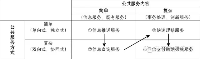 政務(wù)社交媒體不僅可以實現(xiàn)傳統(tǒng)政府網(wǎng)站的信息服務(wù)、在線事務(wù)處理、公眾參與等功能,而且還可以提供一些創(chuàng)新型公共服務(wù)(如微信支付)。政務(wù)社交媒體服務(wù)內(nèi)容的復(fù)雜程度迥異,既有簡單的公共服務(wù),又有復(fù)雜的公共服務(wù),而公共服務(wù)復(fù)雜程度受到服務(wù)內(nèi)容的性質(zhì)和數(shù)量、服務(wù)創(chuàng)新程度等因素的影響。