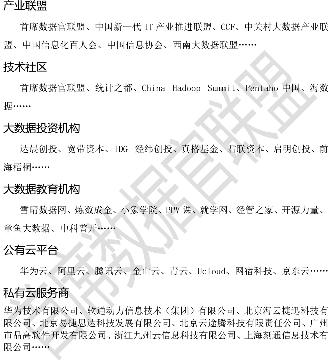 此次《中國大數(shù)據(jù)企業(yè)排行榜》得到業(yè)界的大力支持,發(fā)布會由中華網(wǎng)、中關(guān)村智能硬件產(chǎn)業(yè)聯(lián)盟、北京優(yōu)智活孵化器協(xié)辦。機械工業(yè)信息中心處長白涌如、北京大學電子政務(wù)研究院副院長楊明剛、北京理工大學大數(shù)據(jù)搜索挖掘?qū)嶒炇抑魅螐埲A平、中鋁公司信息管理部副總文欣榮、達晨創(chuàng)投投資總監(jiān)竇勇、易金易(北京)資產(chǎn)管理有限公司CIO侯峰、海爾克路德機器人CTO王運志、北京信息化協(xié)會副理事長馬小東、中華網(wǎng)創(chuàng)新業(yè)務(wù)總監(jiān)熊錦華、China Hadoop Summit創(chuàng)始人何建軍、宏碁電腦營銷總經(jīng)理黃峻濤、陽光信保數(shù)據(jù)開發(fā)部總理安光勇等領(lǐng)導和專家出席發(fā)布會。發(fā)布會由首席數(shù)據(jù)官聯(lián)盟發(fā)起人葛涵濤主持,首席數(shù)據(jù)官聯(lián)盟發(fā)起人劉冬冬代表主辦方致詞,首席數(shù)據(jù)官聯(lián)盟發(fā)起人魯四海對《中國大數(shù)據(jù)企業(yè)排行榜》進行深度解讀。