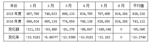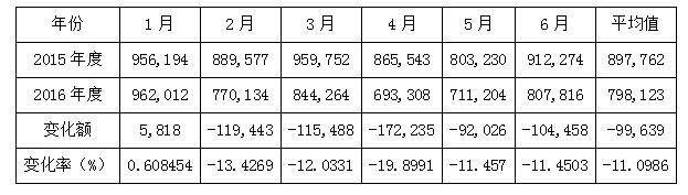 2016年1-6月,日本的電子信息產(chǎn)品進(jìn)口額除6月份外均高于出口額,維持在平均每月0.798萬(wàn)億日元,1月份為峰值,然后逐漸下降。該變化趨勢(shì)受工業(yè)電子設(shè)備影響較大,電子元器件與民用電子設(shè)備的進(jìn)口額變化比較平穩(wěn)(參見(jiàn)圖2)。相較去年同期,除1月份略有增長(zhǎng)以外,其余月份均呈現(xiàn)比較明顯的下降趨勢(shì),平均降幅達(dá)到11.09%(參見(jiàn)表1)。