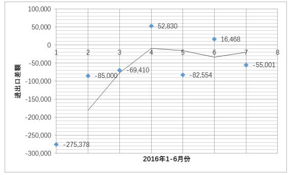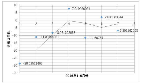 圖5 2016年1-6月日本電子產(chǎn)品進(jìn)出口差額及差比(單位:百萬(wàn)日元)