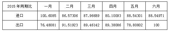 2016年1月貿(mào)易逆差比較明顯,進(jìn)出口差比達(dá)到28.62%,隨后進(jìn)出口差距減小,4月與6月還分別實(shí)現(xiàn)了貿(mào)易順差,單從電子信息產(chǎn)品進(jìn)出口來(lái)看,貿(mào)易狀況總體呈現(xiàn)漸好的趨勢(shì)(參見(jiàn)圖4、圖5)。但是對(duì)比去年同期進(jìn)出口總額發(fā)現(xiàn),截至6月,除1月進(jìn)口與6月出口額同去年基本持平外,其余各月進(jìn)出口總額均有明顯下降,最高降幅達(dá)到23.52%,同去年總體進(jìn)出口額呈現(xiàn)增長(zhǎng)態(tài)勢(shì)相比,今年上半年貿(mào)易規(guī)模明顯萎縮,說(shuō)明2014年開(kāi)始,通過(guò)提高工資水平刺激國(guó)內(nèi)消費(fèi)與進(jìn)口的政策紅利已過(guò),整體電子信息產(chǎn)品貿(mào)易呈現(xiàn)下行趨勢(shì)(參見(jiàn)表3)。