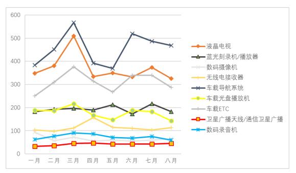 2016年1-8月車(chē)載導(dǎo)航系統(tǒng)、液晶電視的出貨量相對(duì)較高,波動(dòng)性大,均在3月達(dá)到峰值,分別為56.7萬(wàn)臺(tái)和51萬(wàn)臺(tái),相比2015年峰值出貨量分別下降近10萬(wàn)臺(tái)。但車(chē)載導(dǎo)航系統(tǒng)1-8月的平均出貨量相比去年同期增長(zhǎng)了4.87%,而液晶電視則下降8.83%。 車(chē)載ETC、藍(lán)光刻錄機(jī)/播放器和車(chē)載光盤(pán)播放機(jī)出貨量相對(duì)居中,其中車(chē)載ETC的波動(dòng)較大,峰值較去年增長(zhǎng)了近2萬(wàn)臺(tái),1-8月平均出貨量增長(zhǎng)率最高,達(dá)到13.63%,另外兩者變化較為平緩,平均出貨量均呈現(xiàn)下降趨勢(shì)。數(shù)碼攝像機(jī)、無(wú)線電接收器、衛(wèi)星廣播天線和數(shù)碼錄音機(jī)的出貨量相對(duì)較低,除無(wú)線電接收器波動(dòng)較大外,其余變化均相對(duì)平緩,四種產(chǎn)品出貨量相比去年同期也呈現(xiàn)下降趨勢(shì),其中數(shù)碼錄音機(jī)降幅最大,達(dá)到21.12%(參見(jiàn)圖6、表4)。從日本主要消費(fèi)電子設(shè)備的國(guó)內(nèi)出貨量來(lái)看,整體狀況同產(chǎn)值、進(jìn)出口貿(mào)易趨勢(shì)類(lèi)似,呈現(xiàn)萎縮態(tài)勢(shì),車(chē)載導(dǎo)航系統(tǒng)和ETC憑借海外良好的銷(xiāo)售狀況出貨量繼續(xù)增長(zhǎng)。