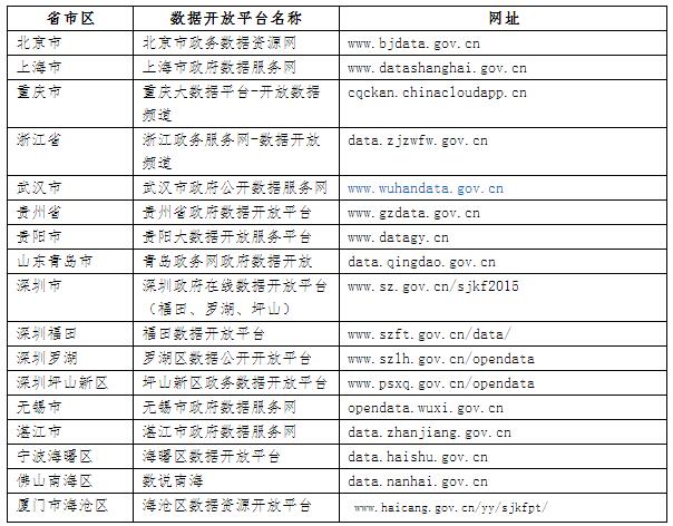政府?dāng)?shù)據(jù)開放平臺(tái)建設(shè)是政府?dāng)?shù)據(jù)開放的重要內(nèi)容。據(jù)初步統(tǒng)計(jì),截至2016年8月,我國(guó)地方政府建有數(shù)據(jù)開放平臺(tái)網(wǎng)站(欄目)的有5個(gè)省級(jí)政府、4個(gè)省會(huì)省市或副省級(jí)城市政府、兩個(gè)其他市政府、8個(gè)區(qū)政府,具體有北京市、上海市、重慶市、浙江省、貴州省;貴州貴陽市、湖北武漢市、廣東深圳市(福田、坪山新區(qū)、羅湖)、山東青島市;廣東湛江市、江蘇無錫市;廣東佛山南海區(qū)、廣東佛山禪城區(qū)、浙江寧波海曙區(qū)、福建廈門市海滄區(qū)、陜西西咸新區(qū)等。具體如表1。