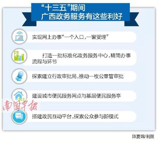 《廣西政務(wù)服務(wù)“十三五”規(guī)劃》(下稱“規(guī)劃”)日前正式出臺(tái)。根據(jù)規(guī)劃,我區(qū)將打造全方位“互聯(lián)網(wǎng)+政務(wù)服務(wù)”,把“群眾跑腿”轉(zhuǎn)變?yōu)椤皵?shù)據(jù)跑腿”,讓群眾通過(guò)電腦、手機(jī)等方式就可以在線辦理各種業(yè)務(wù),極大提高便捷性和效率