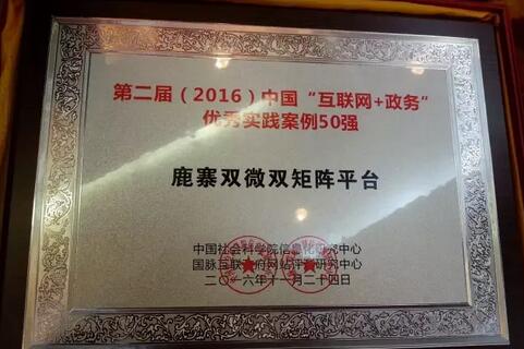 由中國社會科學院信息化研究中心、國脈互聯(lián)政府網(wǎng)站評測研究中心主辦的2016中國智慧政府發(fā)展年會11月24日在北京舉行,鹿寨縣政府網(wǎng)站“雙微雙矩陣平臺”獲評第二屆(2016)“中國互聯(lián)網(wǎng)+政務(wù)”優(yōu)秀實踐案例50強,網(wǎng)站績效測評綜合成績排在縣(市、區(qū))級13名。這也是廣西惟一獲表彰的政府網(wǎng)站。