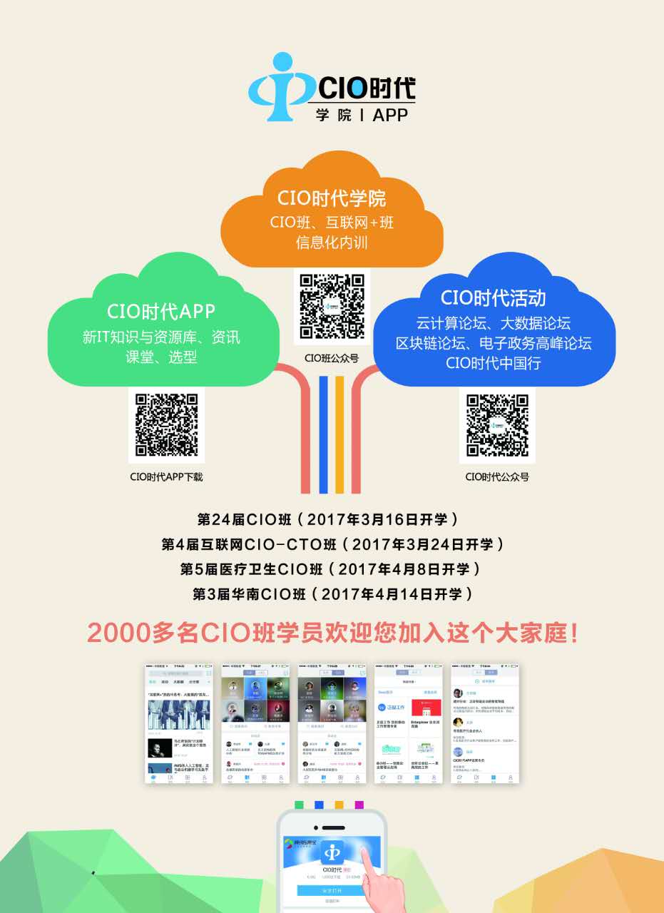 CIO時(shí)代成立于2003年,由當(dāng)時(shí)北大CIO論壇骨干創(chuàng)辦,也是北大科技園創(chuàng)業(yè)中心成立時(shí)從北大校內(nèi)征集的第一批孵化項(xiàng)目。自2005年北大CIO班開辦之后,CIO時(shí)代一直作為北大CIO班的唯一合作辦學(xué)單位。目前,受國家相關(guān)政策影響,北大CIO班停辦之后,CIO時(shí)代啟動(dòng)了CIO時(shí)代學(xué)院,繼續(xù)開展CIO培訓(xùn)。目前CIO時(shí)代學(xué)院開辦的CIO班包括每年2屆的普通CIO班,還包括醫(yī)療衛(wèi)生CIO班、政府CIO班、金融CIO班、互聯(lián)網(wǎng)CIO-CTO班等行業(yè)CIO班,另外還有華南CIO班、福建國資CIO班等地區(qū)CIO班。在聚集了幾千個(gè)學(xué)員資源的基礎(chǔ)上,CIO時(shí)代也開始致力于自身的轉(zhuǎn)型,希望通過移動(dòng)APP繼續(xù)為學(xué)員提供隨時(shí)隨地的在線學(xué)習(xí),把CIO班變成一個(gè)永不畢業(yè)的班級(jí),同時(shí)也為IT業(yè)內(nèi)人士提供一個(gè)資源對(duì)接和交流的平臺(tái)。