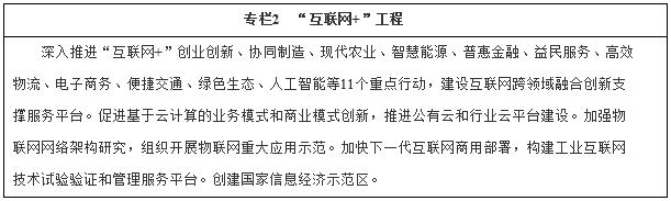 (二)推進(jìn)“互聯(lián)網(wǎng)+”行動(dòng)。促進(jìn)新一代信息技術(shù)與經(jīng)濟(jì)社會(huì)各領(lǐng)域融合發(fā)展,培育“互聯(lián)網(wǎng)+”生態(tài)體系。