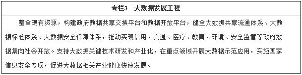 (三)實(shí)施國(guó)家大數(shù)據(jù)戰(zhàn)略。落實(shí)大數(shù)據(jù)發(fā)展行動(dòng)綱要,全面推進(jìn)重點(diǎn)領(lǐng)域大數(shù)據(jù)高效采集、有效整合、公開(kāi)共享和應(yīng)用拓展,完善監(jiān)督管理制度,強(qiáng)化安全保障,推動(dòng)相關(guān)產(chǎn)業(yè)創(chuàng)新發(fā)展。
