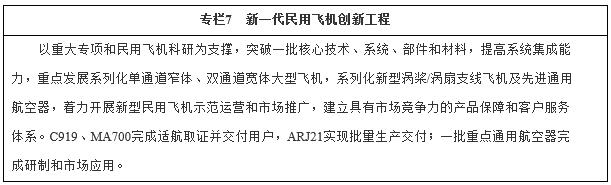 (二)實(shí)現(xiàn)航空產(chǎn)業(yè)新突破。加強(qiáng)自主創(chuàng)新,推進(jìn)民用航空產(chǎn)品產(chǎn)業(yè)化、系列化發(fā)展,加強(qiáng)產(chǎn)業(yè)配套設(shè)施和安全運(yùn)營(yíng)保障能力建設(shè),提高產(chǎn)品安全性、環(huán)保性、經(jīng)濟(jì)性和舒適性,全面構(gòu)建覆蓋航空發(fā)動(dòng)機(jī)、飛機(jī)整機(jī)、產(chǎn)業(yè)配套和安全運(yùn)營(yíng)的航空產(chǎn)業(yè)體系。到2020年,民用大型客機(jī)、新型支線(xiàn)飛機(jī)完成取證交付,航空發(fā)動(dòng)機(jī)研制實(shí)現(xiàn)重大突破,產(chǎn)業(yè)配套和示范運(yùn)營(yíng)體系基本建立。