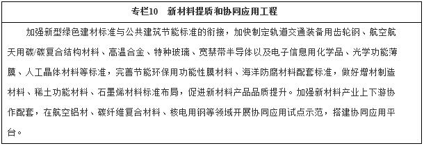 (六)提高新材料基礎(chǔ)支撐能力。順應(yīng)新材料高性能化、多功能化、綠色化發(fā)展趨勢(shì),推動(dòng)特色資源新材料可持續(xù)發(fā)展,加強(qiáng)前沿材料布局,以戰(zhàn)略性新興產(chǎn)業(yè)和重大工程建設(shè)需求為導(dǎo)向,優(yōu)化新材料產(chǎn)業(yè)化及應(yīng)用環(huán)境,加強(qiáng)新材料標(biāo)準(zhǔn)體系建設(shè),提高新材料應(yīng)用水平,推進(jìn)新材料融入高端制造供應(yīng)鏈。到2020年,力爭(zhēng)使若干新材料品種進(jìn)入全球供應(yīng)鏈,重大關(guān)鍵材料自給率達(dá)到70%以上,初步實(shí)現(xiàn)我國(guó)從材料大國(guó)向材料強(qiáng)國(guó)的戰(zhàn)略性轉(zhuǎn)變。