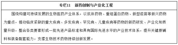(一)構(gòu)建生物醫(yī)藥新體系。加快開(kāi)發(fā)具有重大臨床需求的創(chuàng)新藥物和生物制品,加快推廣綠色化、智能化制藥生產(chǎn)技術(shù),強(qiáng)化科學(xué)高效監(jiān)管和政策支持,推動(dòng)產(chǎn)業(yè)國(guó)際化發(fā)展,加快建設(shè)生物醫(yī)藥強(qiáng)國(guó)。