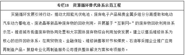 (五)深入推進(jìn)資源循環(huán)利用。樹(shù)立節(jié)約集約循環(huán)利用的資源觀,大力推動(dòng)共伴生礦和尾礦綜合利用、“城市礦產(chǎn)”開(kāi)發(fā)、農(nóng)林廢棄物回收利用和新品種廢棄物回收利用,發(fā)展再制造產(chǎn)業(yè),完善資源循環(huán)利用基礎(chǔ)設(shè)施,提高政策保障水平,推動(dòng)資源循環(huán)利用產(chǎn)業(yè)發(fā)展壯大。到2020年,力爭(zhēng)當(dāng)年替代原生資源13億噸,資源循環(huán)利用產(chǎn)業(yè)產(chǎn)值規(guī)模達(dá)到3萬(wàn)億元。