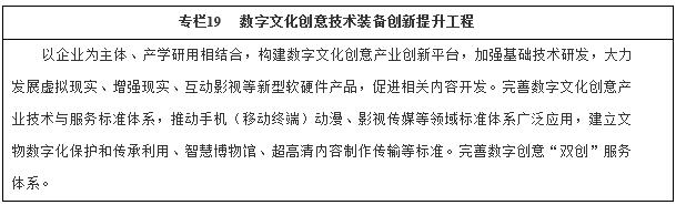 (一)創(chuàng)新數(shù)字文化創(chuàng)意技術(shù)和裝備。適應(yīng)沉浸式體驗(yàn)、智能互動(dòng)等趨勢(shì),加強(qiáng)內(nèi)容和技術(shù)裝備協(xié)同創(chuàng)新,在內(nèi)容生產(chǎn)技術(shù)領(lǐng)域緊跟世界潮流,在消費(fèi)服務(wù)裝備領(lǐng)域建立國(guó)際領(lǐng)先優(yōu)勢(shì),鼓勵(lì)深度應(yīng)用相關(guān)領(lǐng)域最新創(chuàng)新成果。