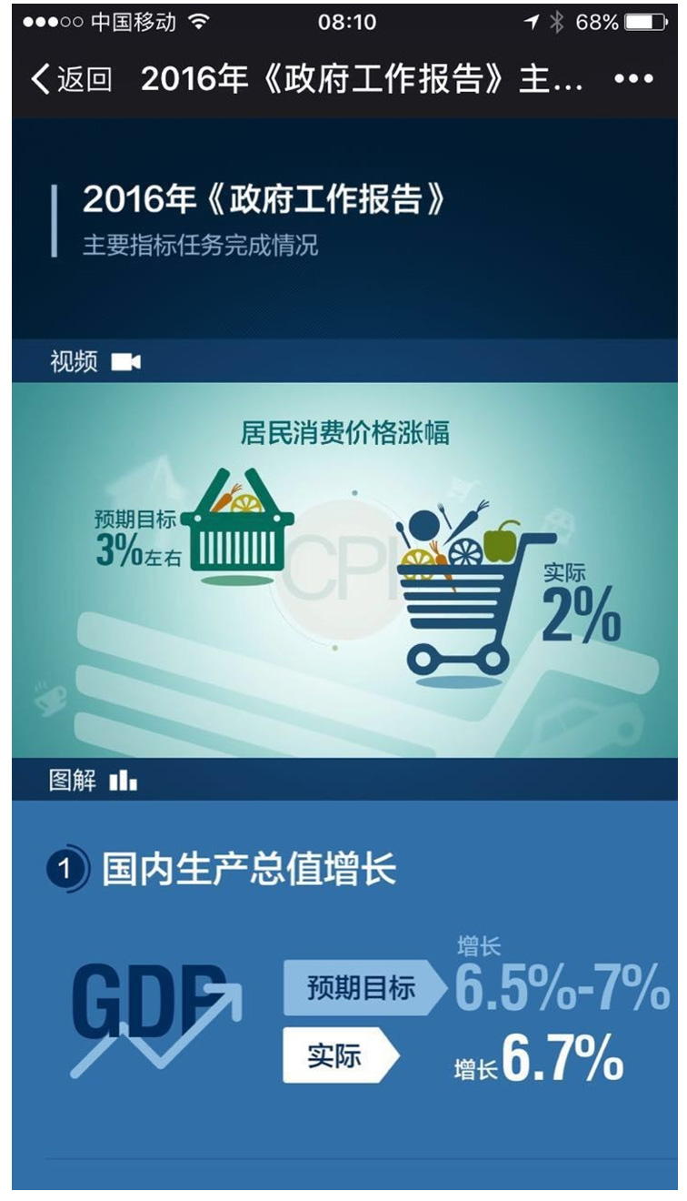比如,在解釋2016年化學(xué)需氧量、氮氧化物排放量下降等治理污染的進(jìn)展時(shí),動(dòng)畫(huà)中的天空顏色逐漸由灰變藍(lán);為了說(shuō)明廣義貨幣的增幅,動(dòng)畫(huà)里出現(xiàn)了一張存折;用于表現(xiàn)居民消費(fèi)價(jià)格指數(shù)的則是菜籃子和超市購(gòu)物車(chē)。為了便于人大代表審議文字報(bào)告時(shí)兩相對(duì)照,對(duì)于上一年度提出的主要指標(biāo)任務(wù),二維碼里存儲(chǔ)的圖表使用了32組醒目的對(duì)比數(shù)據(jù)來(lái)說(shuō)明兌現(xiàn)情況。