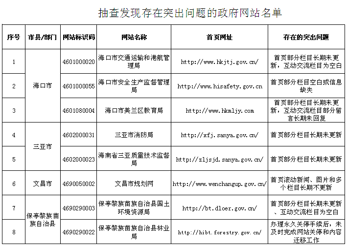 國(guó)土、工商和政府服務(wù)中心等系統(tǒng)基層網(wǎng)站“不合格”現(xiàn)象較為突出?!氨Mだ枳迕缱遄灾慰h國(guó)土環(huán)境資源局”、“瓊海市國(guó)土資源局”和“昌江縣國(guó)土環(huán)境資源局”網(wǎng)站均存在部分欄目長(zhǎng)期不更新、互動(dòng)交流欄目為空白的“不合格”現(xiàn)象;“??谑泄ど绦姓芾砭帧焙汀叭齺喪泄ど绦姓芾砭帧本W(wǎng)站部分欄目長(zhǎng)期未更新;“樂(lè)東縣政務(wù)服務(wù)中心”和“東方市政務(wù)服務(wù)中心”網(wǎng)站首頁(yè)多個(gè)欄目長(zhǎng)期未更新。