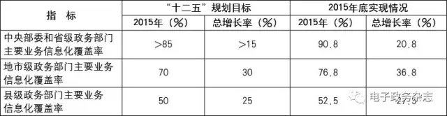 表1 “十二五”末期政務(wù)業(yè)務(wù)信息化覆蓋率及增長(zhǎng)率[1]