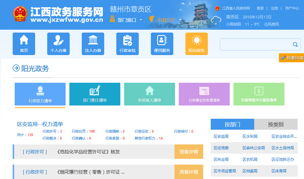 章貢區(qū)政府網(wǎng)站融合了省市縣一體化的"互聯(lián)網(wǎng)+政務(wù)服務(wù)"平臺,建設(shè)章貢區(qū)政務(wù)服務(wù)網(wǎng),平臺集行政審批、便民服務(wù)、陽光政務(wù)、互動交流等功能于一體,實(shí)現(xiàn)了政務(wù)服務(wù)資源的有效整合與共享。平臺按照國家政策要求,推進(jìn)了行政權(quán)力清單、部門責(zé)任清單、市場準(zhǔn)入清單、行政事業(yè)性收費(fèi)清單、行政審批中介服務(wù)清單5張清單公開;按照"個人辦事、法人辦事、部門服務(wù)"三個維度,整合了辦事指南、在線申請、在線咨詢等辦事服務(wù)資源,為公眾提供"一站式"、"一網(wǎng)式"的統(tǒng)一政務(wù)服務(wù),促進(jìn)辦事效率的不斷提高,實(shí)現(xiàn)讓"群眾跑腿"變"信息跑腿"。
