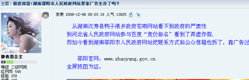 國(guó)脈電子政務(wù)網(wǎng)12月9日訊 從湖南漢壽縣鴨子港鄉(xiāng)政府花哨網(wǎng)站迅速躥紅到河北省人民政府網(wǎng)站參與百度“競(jìng)價(jià)排名”,政府網(wǎng)站被人們熱議的余溫還未散盡,近日,網(wǎng)友又曝出湖南邵陽(yáng)市人民政府網(wǎng)站“掛”上了廣告。