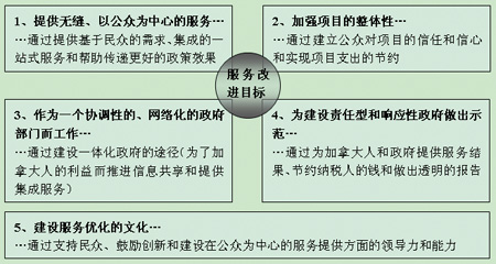 成立于2005年9月的“服務(wù)加拿大”為加拿大人提供安全、內(nèi)容豐富、一站式、個(gè)性化的服務(wù),主要任務(wù)是整合各個(gè)、各級政府部門的相關(guān)服務(wù)項(xiàng)目,建設(shè)統(tǒng)一的服務(wù)提供網(wǎng)絡(luò),為公眾提供方便快捷的“一站式”政府服務(wù)。“服務(wù)加拿大”確立了五個(gè)戰(zhàn)略目標(biāo)(見圖1)。