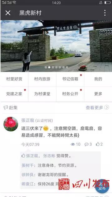 “這還不是最新鮮的。”張樹千掏出手機,向記者演示黑虎村微信公眾號?!拔覀冞@個公眾號已有1200余人關注?!睆垬淝н呇菔具吔榻B,這個公眾號,應用政府網(wǎng)站模塊,整合網(wǎng)絡資源,開設了“美麗黑虎”和“為村平臺”兩大功能板塊?!懊利惡诨ⅰ笔钦㈤T戶集群化建設的功能載體,與邛崍市人民政府門戶網(wǎng)站手機版一鍵連通,群眾可以通過手機享受到政府門戶網(wǎng)站上所有服務。