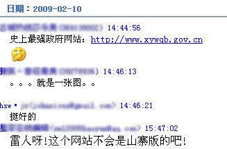 網(wǎng)友稱,無意中打開鏈接http://www.xywqb.gov.cn/ ,發(fā)現(xiàn)是某市外事僑務辦公室網(wǎng)站,但是搞笑的是,咋的一看,該網(wǎng)站和其他政府網(wǎng)站沒有什么區(qū)別,在導航欄中無非是機構(gòu)的介紹、動態(tài)、辦事指南等等,但是當你隨便點擊一個欄目時你就會發(fā)現(xiàn),整個網(wǎng)站分明就是一張名為“index2”的jpg圖片。在記者所在的一個媒體QQ群里,有同行稱:“雷人啊,這個網(wǎng)站不會是山寨版的吧”。