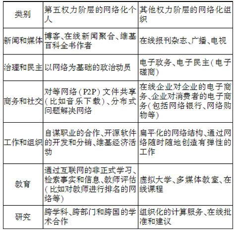 表1 網(wǎng)絡(luò)化組織和個人的不同類別(資料來源:William H. Dutton. The Fifth Estate:Through the Network (of Networks). http://people.oii.ox.ac.uk/dutton/wp-content/uploads/2007/10/5th-estate-lecture-text.pdf.)