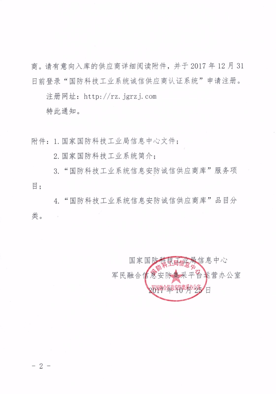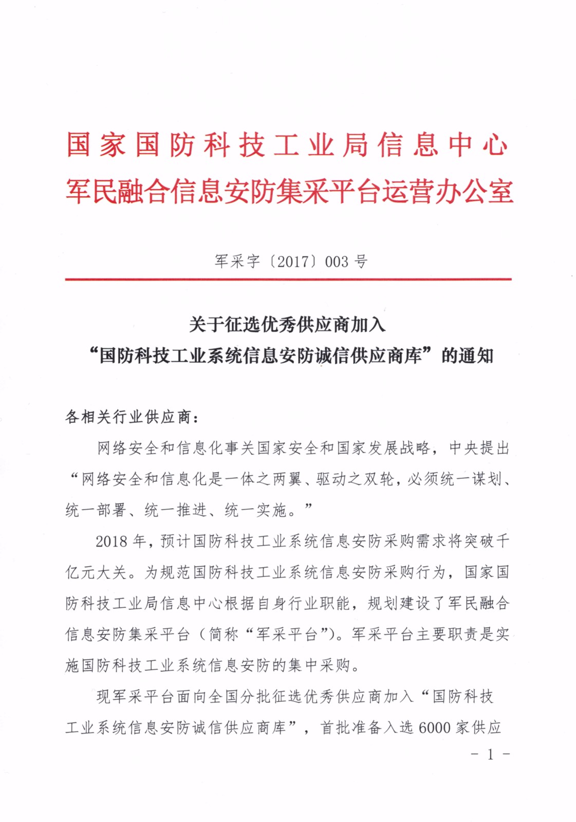 關(guān)于征選優(yōu)秀供應(yīng)商加入“國(guó)防科技工業(yè)系統(tǒng)信息安防誠(chéng)信供應(yīng)商庫(kù)”的通知