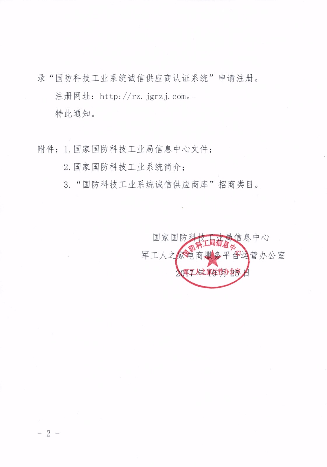 關(guān)于征選優(yōu)秀供應商加入“國防科技工業(yè)系統(tǒng)誠信供應商庫”的通知