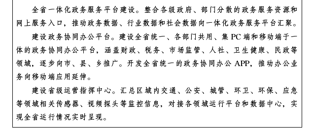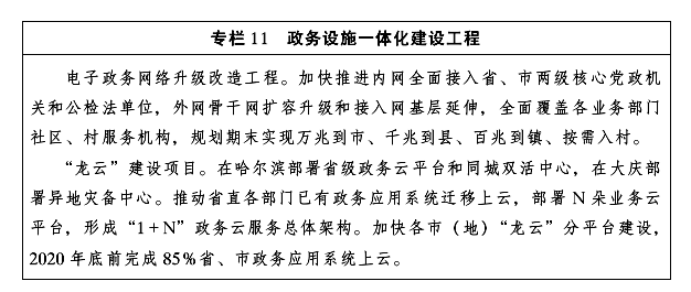數(shù)字政府協(xié)同化。到2020年,初步建成“兩地三中心”統(tǒng)一政務(wù)云平臺,省級政務(wù)服務(wù)事項網(wǎng)上可辦率不低于92%,市、縣級政務(wù)服務(wù)事項網(wǎng)上可辦率不低于80%,政務(wù)系統(tǒng)上云率85%,“誠信龍江”基本建成。到2025年,“龍云”計劃實現(xiàn)省市縣三級覆蓋,政務(wù)協(xié)同辦公一體化平臺、省級運營指揮中心建成運行,全面實現(xiàn)以大數(shù)據(jù)驅(qū)動的政務(wù)服務(wù)和政務(wù)運行新模式。