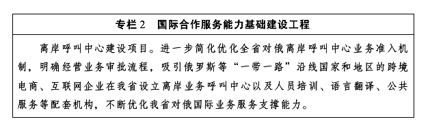 提升國際通信服務(wù)能力。推進(jìn)對俄對歐跨境通信傳輸網(wǎng)絡(luò)建設(shè)優(yōu)化,適時擴(kuò)容網(wǎng)絡(luò)承載能力,增強我省對俄開放通信服務(wù)支撐能力。積極爭取國家支持,開通哈爾濱區(qū)域國際互聯(lián)網(wǎng)轉(zhuǎn)接點,提升我省國際互聯(lián)網(wǎng)節(jié)點地位。爭取在我省沿邊開發(fā)開放試驗區(qū)、綜合保稅區(qū)、邊民互市貿(mào)易區(qū)等園區(qū),開設(shè)對俄國際互聯(lián)網(wǎng)數(shù)據(jù)專用通道,提高園區(qū)企業(yè)國際通信服務(wù)質(zhì)量和安全保障能力。發(fā)揮哈爾濱、牡丹江、大慶等服務(wù)外包政策和產(chǎn)業(yè)優(yōu)勢,支持和鼓勵企業(yè)建設(shè)呼叫中心,重點發(fā)展面向通信、金融、先進(jìn)制造、互聯(lián)網(wǎng)等產(chǎn)業(yè)的語音、在線等客戶服務(wù)業(yè)務(wù)。進(jìn)一步簡化優(yōu)化離岸呼叫業(yè)務(wù)審批流程,吸引企業(yè)投資設(shè)立離岸呼叫中心,拓展離岸呼叫外包服務(wù),支撐“中蒙俄經(jīng)濟(jì)走廊”建設(shè),助力“一帶一路”國際合作。