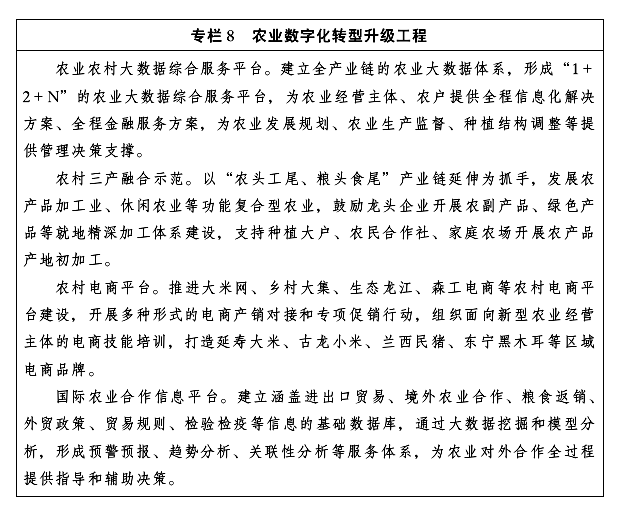 全國數(shù)字農(nóng)業(yè)先導(dǎo)區(qū)。發(fā)揮國家糧食“壓艙石”和現(xiàn)代農(nóng)業(yè)基地優(yōu)勢,打造機械化與信息化深度融合“龍江樣板”,圍繞“糧頭食尾”和“農(nóng)頭工尾”,加快糧食主產(chǎn)區(qū)、境外農(nóng)業(yè)合作示范區(qū)數(shù)字化改造,開展農(nóng)村一二三產(chǎn)業(yè)融合示范建設(shè),打造具有影響力的全國數(shù)字農(nóng)業(yè)先導(dǎo)示范區(qū)。