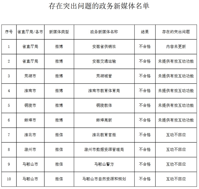 一些政務(wù)微信日常運維檢查力度不夠,微信菜單鏈接無法訪問。上季度通報“安徽省供銷社”微博內(nèi)容更新不及時問題,至今仍未整改到位。“安徽交通運輸”“蕪湖城管”“淮南市教育體育局”“銅陵教體”“蚌埠高新”微博關(guān)閉網(wǎng)民留言評論渠道,其中“蚌埠高新”微博發(fā)布內(nèi)容多為轉(zhuǎn)發(fā)內(nèi)容,缺少本單位政務(wù)信息。“淮北教育官微”“滁州市數(shù)據(jù)資源管理局”“馬鞍山警方”“馬鞍山市自然資源和規(guī)劃”微信未及時辦理網(wǎng)民留言、回應(yīng)群眾關(guān)切。