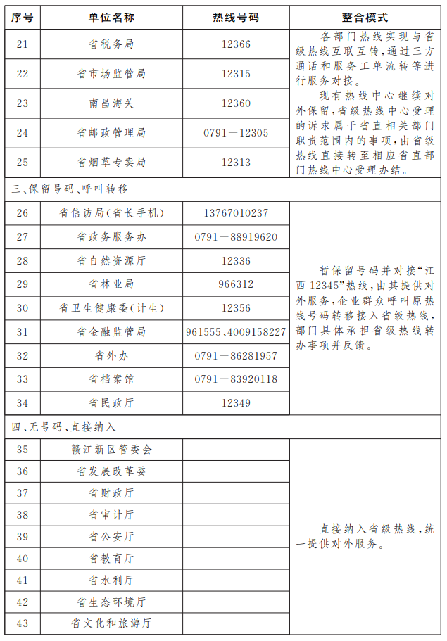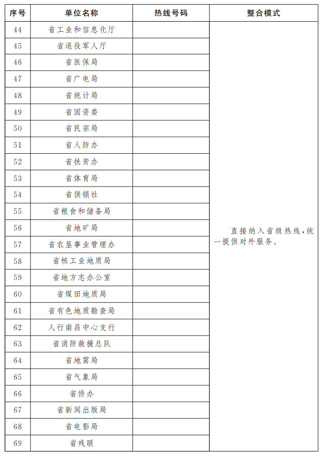 1.明確熱線范圍。除110、119、120、122等緊急救援、警務(wù)類熱線外,其他政府部門服務(wù)熱線全部納入整合范圍。沒有熱線的部門直接納入江西12345。逐步建立110、119、120、122等緊急救援類、警務(wù)類熱線與江西12345互通互轉(zhuǎn)服務(wù)機(jī)制。暫不整合各級黨群部門、社會團(tuán)體和公共服務(wù)企業(yè)的服務(wù)熱線。