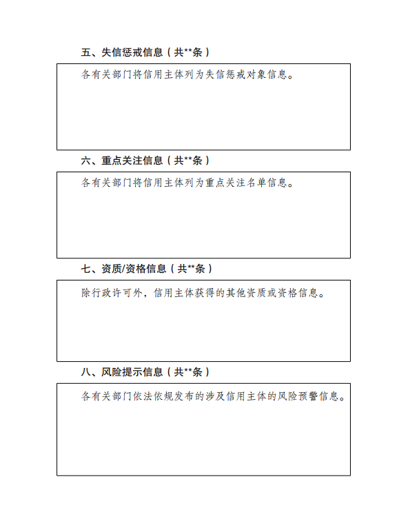 其他信息:涉及信用主體的信用評(píng)價(jià)信息(如公共信用綜合評(píng)價(jià)信息、行業(yè)信用評(píng)價(jià)信息等)、信用修復(fù)信息、信用承諾信息以及其他與信用主體信用狀況相關(guān)的信息。