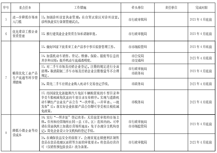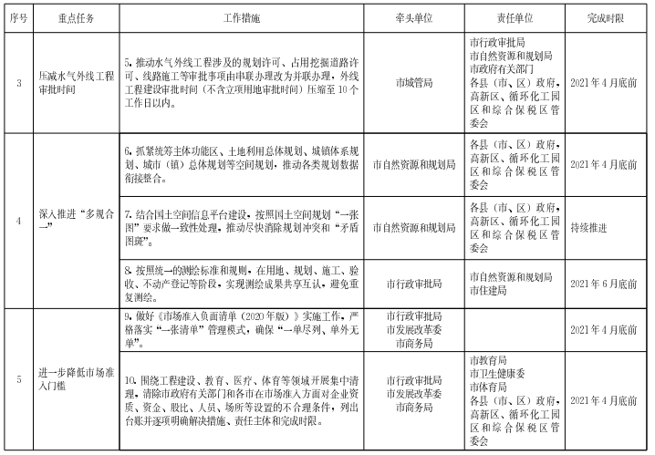 (五)進一步降低市場準入門檻。做好《市場準入負面清單(2020年版)》實施工作,嚴格落實“一張清單”管理模式,確保“一單盡列、單外無單”。圍繞工程建設、教育、醫(yī)療、體育等領域開展集中清理,清除市有關部門和各市在市場準入方面對企業(yè)資質、資金、股比、人員、場所等設置的不合理條件,列出臺賬并逐項明確解決措施、責任主體和完成時限。加強診所設置執(zhí)業(yè)管理,在自貿試驗區(qū)對診所設置、診所執(zhí)業(yè)實行備案管理試點,條件成熟后在全市推廣。