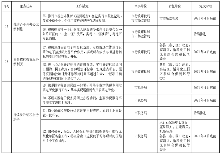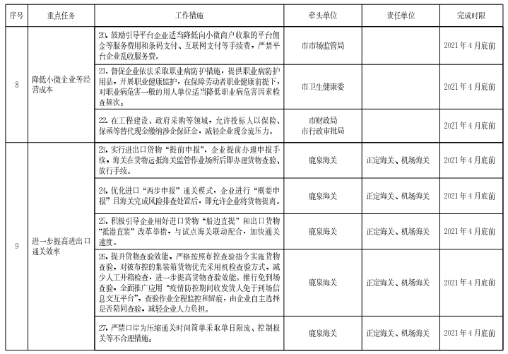 為貫徹落實《河北省人民政府辦公廳關于進一步優(yōu)化營商環(huán)境更好服務市場主體若干措施》(冀政辦字〔2020〕170號)精神,結合統(tǒng)籌常態(tài)化疫情防控和經濟社會發(fā)展要求,更好服務市場主體,切實解決企業(yè)生產經營中的堵點、痛點、難點,加快建設一流營商環(huán)境體系,制定如下措施。