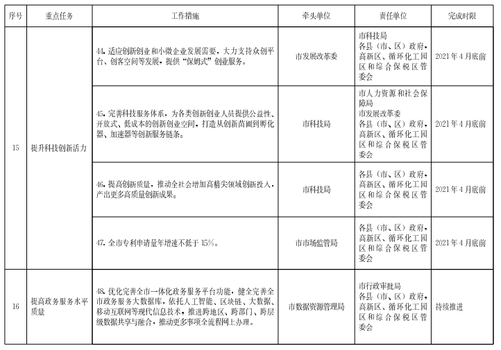 (十五)提升科技創(chuàng)新活力。適應創(chuàng)新創(chuàng)業(yè)和小微企業(yè)發(fā)展需要,大力支持眾創(chuàng)平臺、創(chuàng)客空間等發(fā)展,提供“保姆式”創(chuàng)業(yè)服務。完善科技服務體系,為各類創(chuàng)新創(chuàng)業(yè)人員提供公益性、開放式、低成本的創(chuàng)新創(chuàng)業(yè)空間,打造從創(chuàng)新苗圃到孵化器、加速器等創(chuàng)新服務鏈條。提高創(chuàng)新質量,推動全社會增加高精尖領域創(chuàng)新投入,產出更多高質量創(chuàng)新成果。全市專利申請量年增速不低于15%。