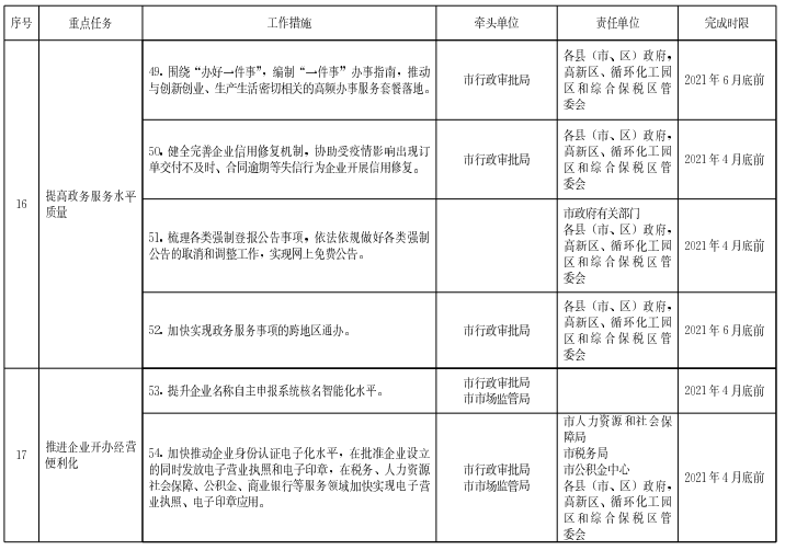 ?。ㄊ┨岣哒辗账劫|量。優(yōu)化完善全市一體化政務服務平臺功能,健全完善全市政務服務大數(shù)據(jù)庫,依托人工智能、區(qū)塊鏈、大數(shù)據(jù)、移動互聯(lián)網(wǎng)等現(xiàn)代信息技術,推進跨地區(qū)、跨部門、跨層級數(shù)據(jù)共享與融合,推動更多事項全流程網(wǎng)上辦理。圍繞“辦好一件事”,編制“一件事”辦事指南,推動與創(chuàng)新創(chuàng)業(yè)、生產生活密切相關的高頻辦事服務套餐落地。健全完善企業(yè)信用修復機制,協(xié)助受疫情影響出現(xiàn)訂單交付不及時、合同逾期等失信行為企業(yè)開展信用修復。梳理各類強制登報公告事項,依法依規(guī)做好各類強制公告的取消和調整工作,實現(xiàn)網(wǎng)上免費公告。加快實現(xiàn)政務服務事項的跨地區(qū)通辦。