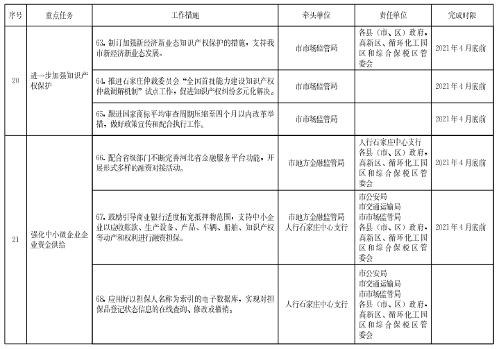 (二十)進一步加強知識產權保護。制訂加強新經濟新業(yè)態(tài)知識產權保護的措施,支持我市新經濟新業(yè)態(tài)發(fā)展。推進石家莊仲裁委員會“全國首批能力建設知識產權仲裁調解機制"試點工作,促進知識產權糾紛多元化解決。跟進國家商標平均審查周期壓縮至四個月以內改革舉措,做好政策宣傳和配合執(zhí)行工作。