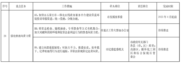 (二十八)強化督查問責力度。加快在石家莊市一體化在線政務服務平臺建設營商環(huán)境投訴舉報渠道,統(tǒng)一受理,分級辦理。將常態(tài)檢查、隨機抽查、專項督查等方式有機集合,加大對破壞營商環(huán)境和侵害企業(yè)利益行為的督查問責力度。建立內部通報制度,對執(zhí)行不力、推諉扯皮、效率低下、紀律松弛等行為進行通報,并依法依規(guī)依紀追責問責。