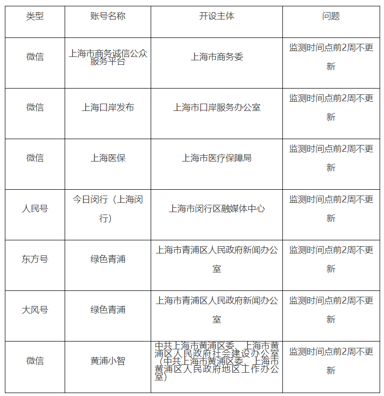 上海醫(yī)保、上海口岸發(fā)布等4個(gè)政務(wù)微信賬號(hào),上海閔行、綠色青浦等3個(gè)其他平臺(tái)賬號(hào)在監(jiān)測(cè)時(shí)點(diǎn)前兩周沒有更新。其中,在對(duì)前期排查整治過程中發(fā)的問題賬號(hào)復(fù)查中,發(fā)現(xiàn)黃浦小智政務(wù)微信賬號(hào)仍存在更新不及時(shí)現(xiàn)象,現(xiàn)已通報(bào)黃浦區(qū)政府安排專人、專項(xiàng)進(jìn)行督導(dǎo)整改。